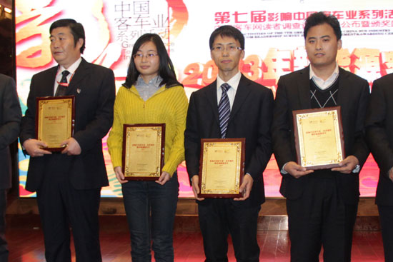 經(jīng)過(guò)近百萬(wàn)有效讀者的參與投票,以及客運(yùn)企業(yè)高層領(lǐng)導(dǎo)、客車(chē)用戶(hù)代表、客車(chē)行業(yè)資深行業(yè)專(zhuān)家、主流媒體領(lǐng)導(dǎo)出任的“專(zhuān)家評(píng)委”認(rèn)真評(píng)議后。中通客車(chē)榮獲了影響中國(guó)客車(chē)業(yè)•讀者調(diào)查――“中國(guó)市場(chǎng)推薦客車(chē)”、“推薦校車(chē)”、“推薦新能源客車(chē)”、“海外市場(chǎng)推薦車(chē)型”四項(xiàng)大獎(jiǎng)。頒獎(jiǎng)現(xiàn)場(chǎng),鎂光燈及所有在場(chǎng)人員將羨慕與贊許的目光一次次聚焦在領(lǐng)獎(jiǎng)臺(tái)上的中通代表身上,對(duì)中通的卓越表現(xiàn)給予了由衷的贊賞與肯定。