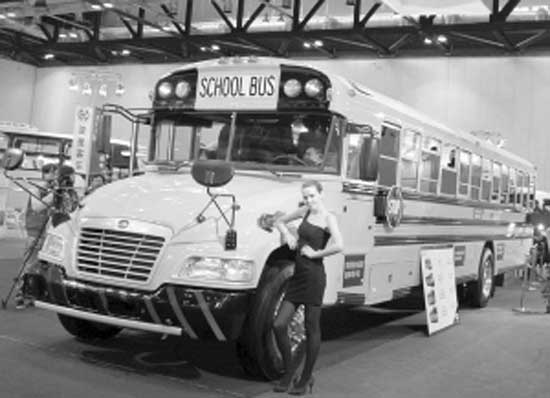 2月16日,美國藍鳥汽車廠家制造的“長鼻子”校車在北京展出。