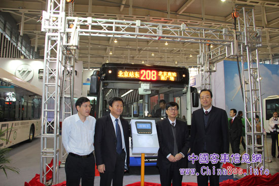 中國城市公共交通協(xié)會科學(xué)技術(shù)分會理事長李世豪和北京公交集團(tuán)副總經(jīng)理馮幸福為福田歐輝新車揭幕