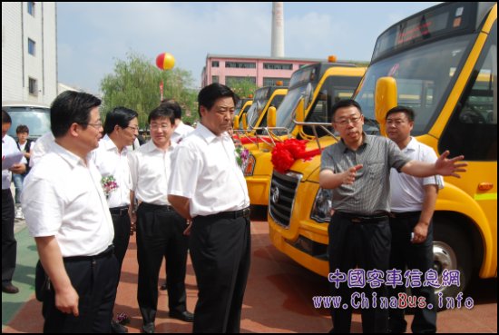 盤錦市市長蹇彪及相關領導參觀黃海校車,黃?蛙囆麄魈庨L林崇富為其講解黃海校車