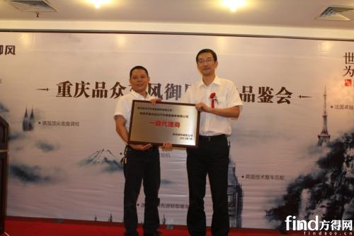 熊偉現(xiàn)場將東風御風一級代理商匾牌授予重慶品眾董事長沈永剛手中