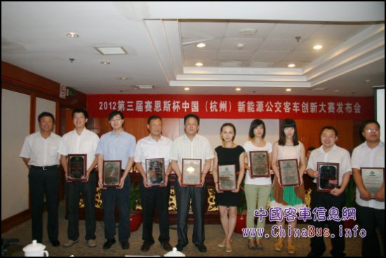 2012年8月8日,第三屆賽恩斯杯中國(guó)(杭州)節(jié)能與新能源公交客車創(chuàng)新大賽發(fā)布會(huì)在北京大方飯店舉行。中國(guó)城市公共交通協(xié)會(huì)科學(xué)技術(shù)分會(huì)秘書長(zhǎng)葉東強(qiáng)、中國(guó)城市公共交通協(xié)會(huì)科學(xué)技術(shù)分會(huì)理事長(zhǎng)李世豪以及北京公交集團(tuán)有限公司副總經(jīng)理馮幸福、杭州公交集團(tuán)有限公司技術(shù)部部長(zhǎng)高新華、天津公交集團(tuán)物資有限公司董事長(zhǎng)許重光、寧波市公交總公司副總經(jīng)理許賡等領(lǐng)導(dǎo)出席會(huì)議。