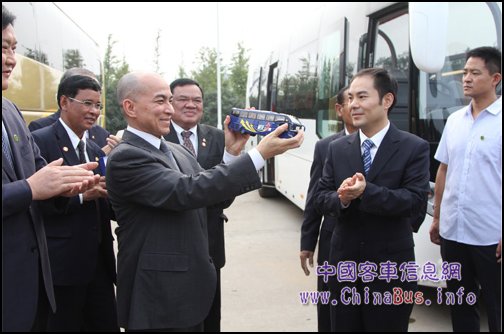 在騰飛廣場(chǎng),西哈莫尼親自登上機(jī)場(chǎng)擺渡車和純電動(dòng)觀光車,他稱贊宇通客車時(shí)尚靚麗、做工精湛、牢固可靠。臨行前,牛波向西哈莫尼贈(zèng)送宇通車模留念,西哈莫尼回贈(zèng)吳哥窟紀(jì)念品表達(dá)謝意。