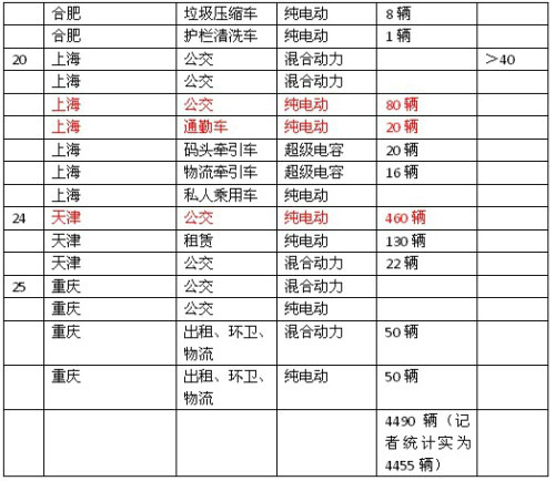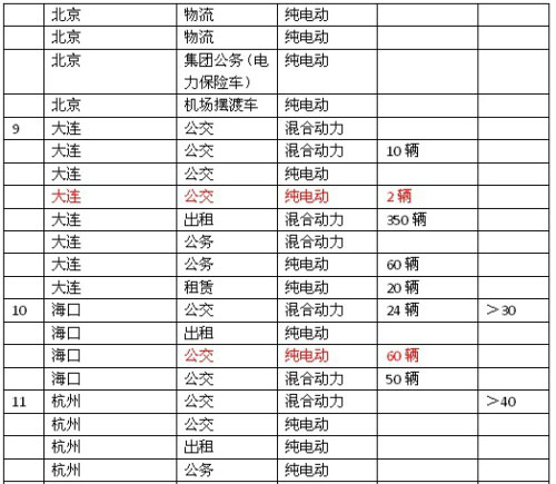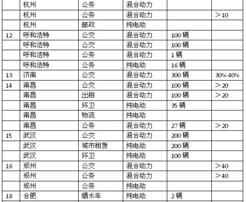 在本表中,一共有21個(gè)城市,它們計(jì)劃采購(gòu)2456輛新能源公交車(包括通勤車)、610輛環(huán)衛(wèi)車(包括超級(jí)電容碼頭牽引車、超級(jí)電容物流牽引車)、980輛出租車(包括租賃用車)、409輛公務(wù)車,其中純電動(dòng)公交車784輛,混合動(dòng)力公交車1606輛,增程式公交車66輛;純電動(dòng)環(huán)衛(wèi)車505輛,混合動(dòng)力環(huán)衛(wèi)車105輛;純電動(dòng)出租車430輛,混合動(dòng)力出租車550輛;純電動(dòng)公務(wù)車366輛,混合動(dòng)力公務(wù)車43輛。