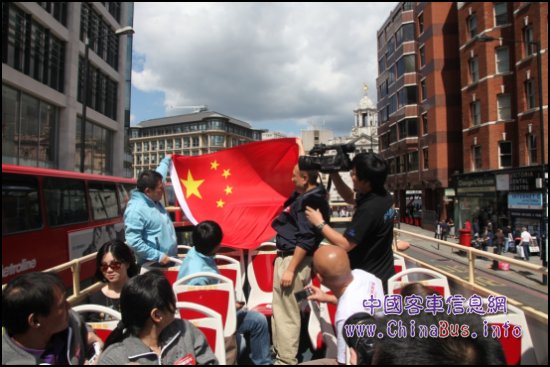 中國游客們在安凱雙層車上揚起國旗為奧運健兒助威