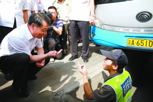 圖為楊傳堂在重慶龍頭寺長途客運站與車輛安全檢測工作人員親切交談。