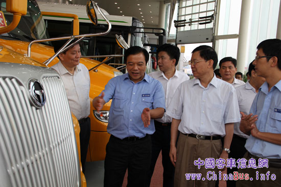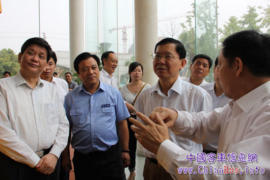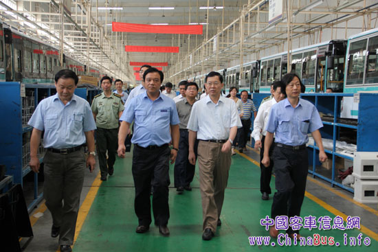 國家監(jiān)察部副部長(zhǎng)郝明金(左二)在恒通客車總經(jīng)理鄭先國(左三)陪同下參觀恒通生產(chǎn)線