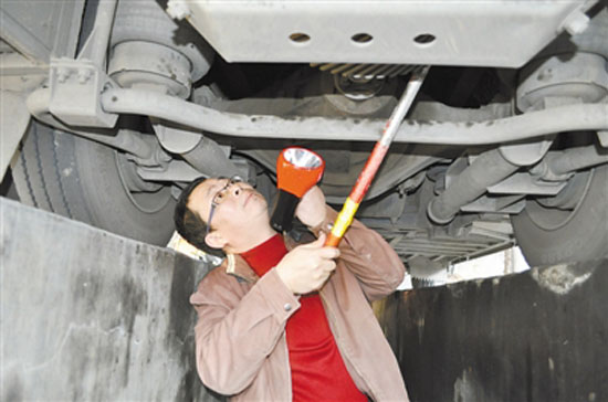 近日,永定成立了由12名技術人員組成的3支檢測維修隊,3隊輪流對140輛即將參與春運的客運車進行安全檢測,并規(guī)定所有長途車開回車站后都必須接受安全性能檢測。圖為1月8日,技術員在汽車檢測坑道對車輛進行檢測。