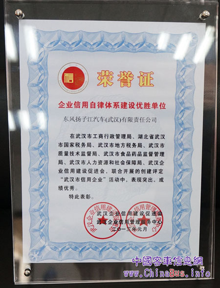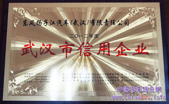 2013年1月15日,在中共武漢市委會(huì)議中心,舉行了第八次“武漢市信用企業(yè)”授牌大會(huì)暨武漢市企業(yè)信用建設(shè)促進(jìn)會(huì)第五次會(huì)員大會(huì)上,由武漢市工商行政管理局、湖北省武漢市國家稅務(wù)局、武漢市地方稅務(wù)局、武漢市質(zhì)量技術(shù)監(jiān)督局、武漢市食品藥品監(jiān)督管理局、武漢市人力資源和社會(huì)保障局、武漢企業(yè)信用建設(shè)促進(jìn)會(huì),聯(lián)合開展的創(chuàng)建評定“武漢市信用企業(yè)”活動(dòng)中,揚(yáng)子江汽車被授予“2012年度武漢市信用企業(yè)”光榮稱號!