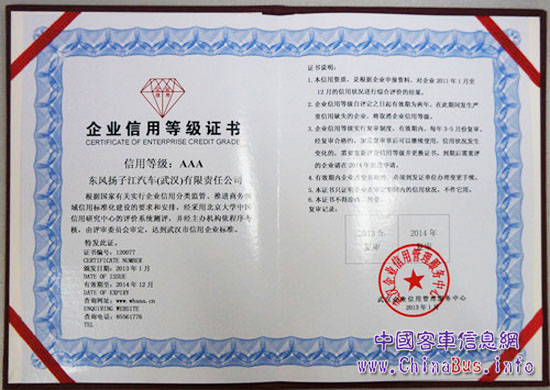 揚(yáng)子江汽車信用企業(yè)等級證書