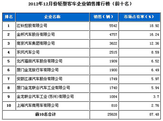 2012年12月輕型客車企業(yè)銷售排行前十(圖)