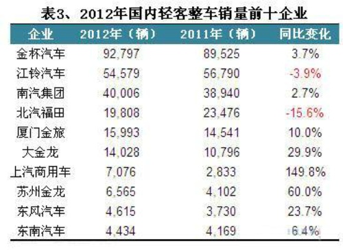 輕客市場(chǎng)中,2012年銷(xiāo)量前十企業(yè)依次是金杯汽車(chē)、江鈴控股、南汽集團(tuán)、北汽福田、廈門(mén)金旅、大金龍、上汽商用車(chē)、蘇州金龍、東風(fēng)汽車(chē)和東南汽車(chē)。其中,金杯汽車(chē)霸主地位不可動(dòng)搖,2012年銷(xiāo)量實(shí)現(xiàn)9.28萬(wàn)輛,遠(yuǎn)高于其他企業(yè),比銷(xiāo)量第二高的江鈴控股高出3.82萬(wàn)輛。