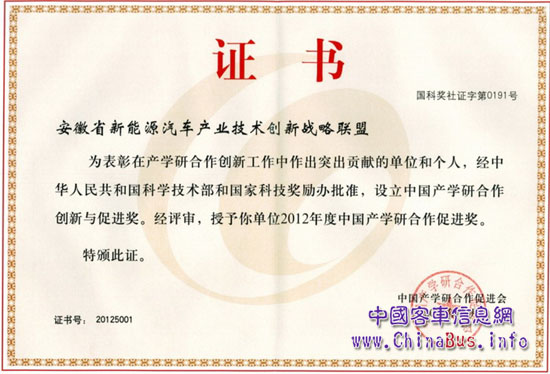 安徽省新能源汽車產業(yè)技術創(chuàng)新戰(zhàn)略聯(lián)盟憑借著卓越的成績獲得2012年度中國產學研合作促進獎。