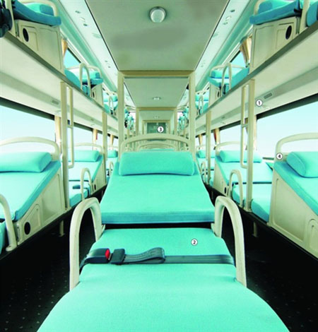 今年7月25日,中通代臥客車“世紀(jì)星”在山東威!虾>路投入運(yùn)營。該款代臥客車設(shè)置了活動座椅來滿足乘客躺臥需求,智能管理系統(tǒng)可根據(jù)司機(jī)眨眼次數(shù)判斷其是否疲勞駕駛并作出提醒,司機(jī)連續(xù)開車超過4小時將發(fā)出提醒警報,GPS定位系統(tǒng)可全程監(jiān)視客車行駛過程。還解決了臥鋪客車安全通道不暢通、安全出口小等問題。海格、宇通等企業(yè)也開發(fā)出了代臥客車。