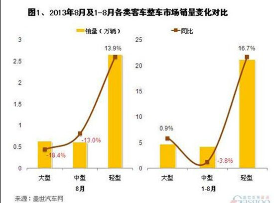 1-8月來(lái)看,輕客則是客車增長(zhǎng)的主力,輕客前8個(gè)月銷量累計(jì)21.16萬(wàn)輛,同比增長(zhǎng)16.7%,而大客和中客卻僅微增長(zhǎng)甚至出現(xiàn)下滑。