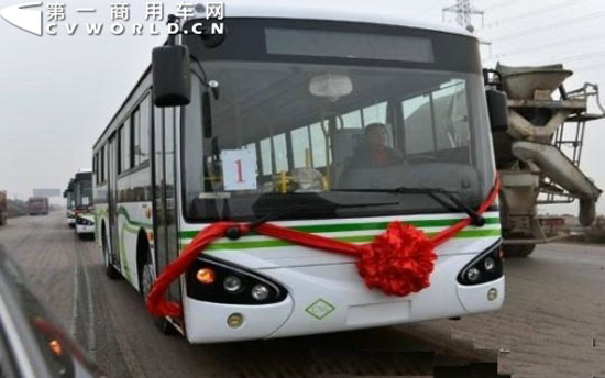 11月13日下午,伴隨一陣劈里啪啦的鞭炮聲,掛著紅花的30部天然氣公交車開出上汽唐山客車有限公司大院,駛往唐山市區(qū)。該公司負(fù)責(zé)人說,首批交付車輛共計60部,明日仍有30部交付唐山市公交總公司。