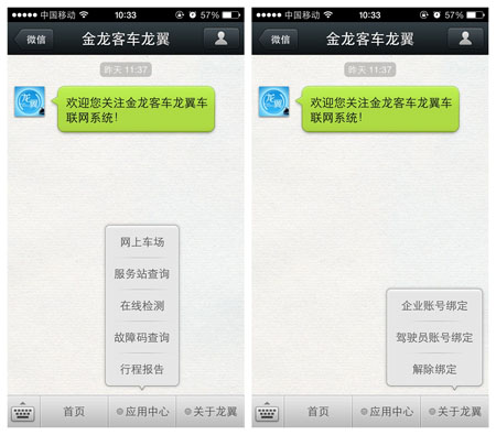 經(jīng)過兩個多月的開發(fā)設(shè)計以及與微信平臺的高級數(shù)據(jù)接口調(diào)試,“金龍客車•龍翼”微信平臺現(xiàn)已成功上線,成為客車行業(yè)首家推出微信服務(wù)功能的車聯(lián)網(wǎng)系統(tǒng)。企業(yè)用戶搜索服務(wù)號“金龍客車龍翼”并關(guān)注,綁定之前的運營管理系統(tǒng)的企業(yè)賬號,即可正常使用。