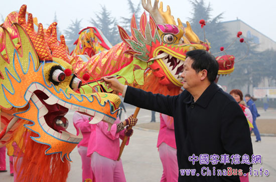 龍獅舞出艷陽天,鑼鼓敲出幸福年。2月19日,農(nóng)歷正月初十,公司隆重舉行2013年新春開工儀式。公司領(lǐng)導(dǎo)早早地來到行政樓西門前,列隊(duì)歡迎員工返回工作崗位。儀式現(xiàn)場,湯總還親自為祥龍?zhí)峁P點(diǎn)睛,寓意宇通事業(yè)如巨龍一般一飛沖天。