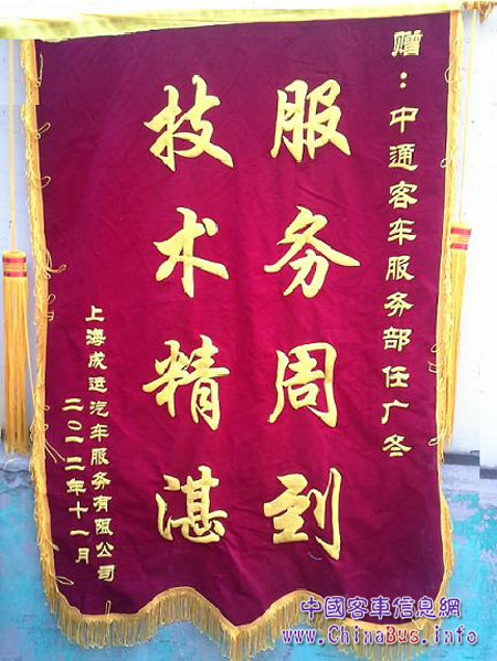 近日,上海成運汽車服務(wù)有限公司將一面“服務(wù)周到 技術(shù)精湛”的錦旗寄至中通客車技術(shù)服務(wù)部,對上海服務(wù)人員任廣冬同志的服務(wù)工作給予了高度評價和真誠的感謝…..