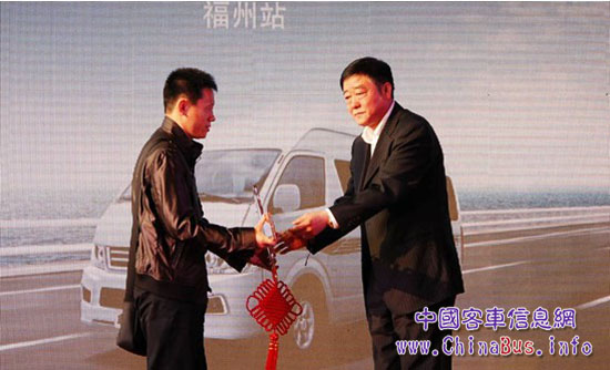 大金龍輕客事業(yè)部副總經(jīng)理邵恩瑞向全國首位凱歌車主贈(zèng)送金鑰匙