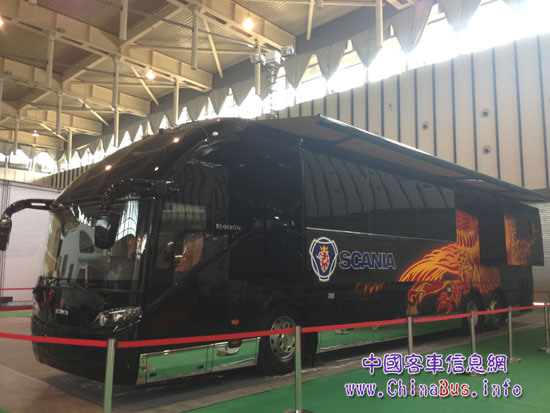 展會(huì)現(xiàn)場(chǎng),最為奪人眼球的,莫過于一輛長(zhǎng)達(dá)13.7米,高3.8米的斯堪尼亞•海格VIP房車了,他通體黑色,威武霸氣,車身上繪有金黃色雄鷹,高端華麗。據(jù)介紹,這輛高檔房車采用“世界公路之王”瑞典斯堪尼亞原裝底盤,上裝由海格客車精心打造,價(jià)值逼近千萬元。