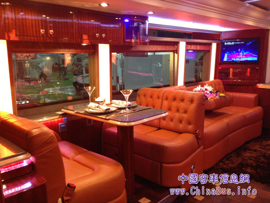 多功能會(huì)客廳主要包括乘客區(qū)、餐飲區(qū)等。其中乘客區(qū)的三人沙發(fā)尤其令筆者青睞,據(jù)介紹,該沙發(fā)具有電動(dòng)可調(diào)180°功能,面料均為頂級(jí)奢侈品愛馬仕專用皮,在享受頂級(jí)皮質(zhì)舒適的同時(shí)盡顯奢華。此區(qū)域還配有觸摸式控制系統(tǒng),車上所有水電供應(yīng)一鍵掌控。46寸超大的LED電視,豐富的影音娛樂系統(tǒng),讓乘客在自由旅程中盡顯無限精彩。