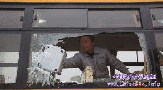 此外,東風客車公司對東風校車電控破玻系統(tǒng)的可靠性進行試驗,試驗員打開爆破按鈕上防止誤操作的保護蓋,按下了爆破按鈕,儲能電池與作用電路接通,安裝在車窗玻璃上的電控破玻裝置產(chǎn)生的沖擊波能量接觸車窗玻璃,不到一秒鐘,瞬間擊碎了整塊鋼化玻璃。鋼化玻璃的碎片沒有四濺,而是在整塊玻璃上形成如同蜂窩狀的裂紋。