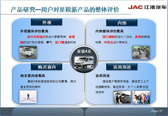 這一報告最讓人關注的是,在市場上現(xiàn)有的主要歐系輕客短軸產(chǎn)品中,江淮星銳4系的用戶購買意向度最高。測試報告以市場現(xiàn)有的5大歐系輕客品牌為研究對象,其中包括兩大合資品牌。購買意向度的測試分“第一眼看到時”、“看完外觀和內飾后”及“了解參數(shù)、配置和品牌后”三個環(huán)節(jié)進行,然后再評選出最后測試結果。在三個測試環(huán)節(jié)中,4系成績一路領先。最終在購買意向度的測試中,4系名列首位。