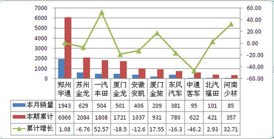 累計(jì)銷售前5名依次為鄭州宇通、蘇州金龍、一汽豐田、廈門金龍、和安徽安凱,累計(jì)銷量分別為6066輛、2084輛、1808輛、1721輛和1037輛。