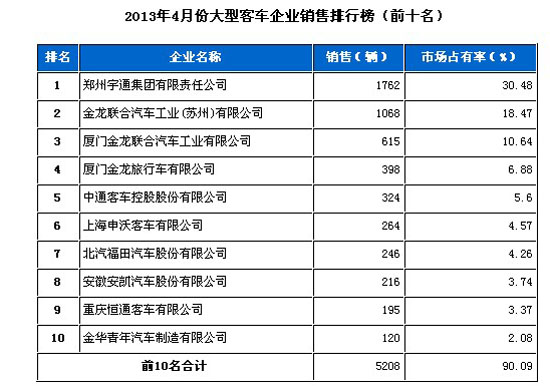 2013年4月大型客車企業(yè)銷售排行前十