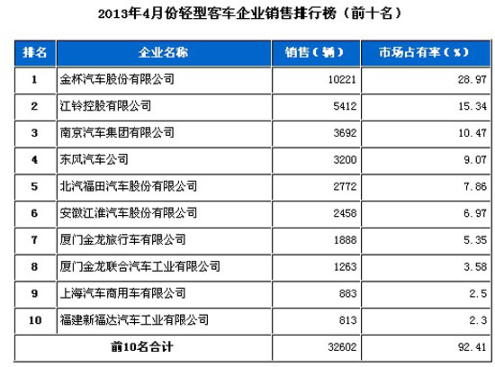 2013年4月輕型客車企業(yè)銷售排行前十