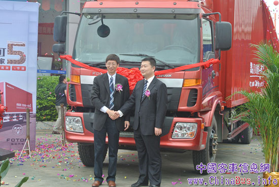 福田歐馬可業(yè)務(wù)總監(jiān)顧德華與北京福田康明斯發(fā)動(dòng)機(jī)有限公司總經(jīng)理關(guān)章華在歐馬可5系新品前合影