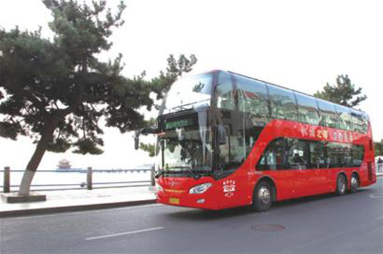 交運雙層觀光巴士帶您暢游青島。交運溫馨巴士31路純電動公交車。