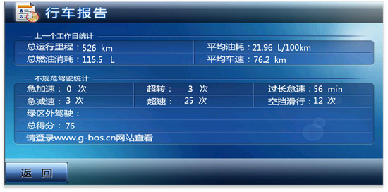 更多的人機(jī)交互功能:駕駛員操作可以做到即時(shí)語音提醒,改變G-BOS事后管理模式?梢愿鶕(jù)管理需要設(shè)定語音提醒項(xiàng)目。G-BOSⅡ代車載終端開機(jī)時(shí)顯示前一工作日的車輛運(yùn)行數(shù)據(jù)及駕駛員的操作信息,如總里程、總?cè)加拖、平均油耗、不?guī)范駕駛統(tǒng)計(jì)等,便于駕駛員及時(shí)了解自己的駕駛行為和行駛信息,進(jìn)行針對(duì)性規(guī)范和改進(jìn)。