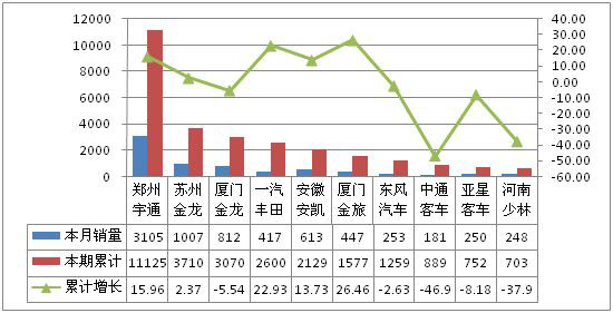 累計銷售前5名依次為鄭州宇通、蘇州金龍、廈門金龍、一汽豐田、和安徽安凱,累計銷量分別為11125輛、3710輛、3070輛、2600輛和2129輛。