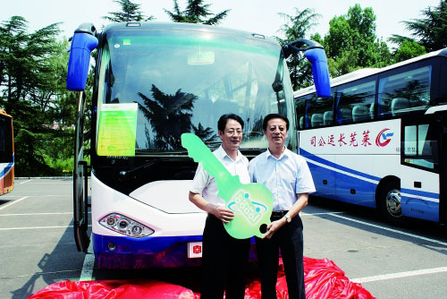 中通客車總經(jīng)理孫慶民(右)將第1萬輛燃氣客車交付濟南長運總經(jīng)理助理張紀軍