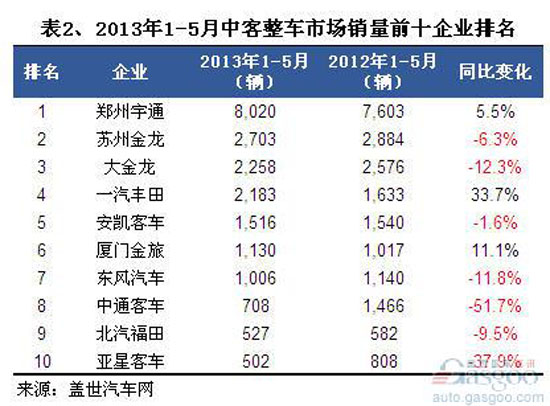 除鄭州宇通以外,前十中銷量增長的還有一汽豐田和廈門金旅。這三個增長的企業(yè)中,一汽豐田銷量增幅最高,前五月中客銷量增長33.7%,廈門金旅銷量實現11.1%的增長。