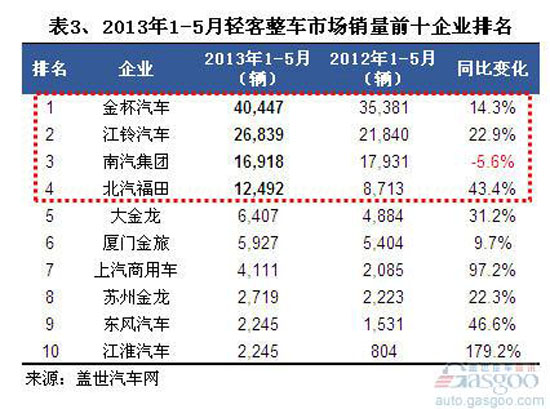 輕客銷量前十中,1-5月增長最快的則是江淮和上汽商用車公司,分別增長179.2%和97.2%。