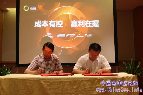 在推介會現(xiàn)場的LCC工程簽約儀式上,遼寧虎躍快速汽車客運股份有限公司技術部部長田再國、鞍山龍騰快速汽車客運集團副總經(jīng)理姜世超、沈陽經(jīng)緯客運有限公司總經(jīng)理于志江,分別代表各自企業(yè)與宇通簽署了LCC工程合作實施協(xié)議。