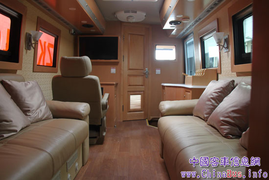 首次參展的ZK5180XZS1商務(wù)車采用宇通自制底盤,車長12米,寬2.55米,高3.9米,整車造型圓潤大氣,極富美感。宇通整車陰極電泳技術(shù)的使用,為車身的持久亮麗如新提供了強(qiáng)有力的保障。該車車側(cè)裝備2臺55寸三星液晶電視機(jī),可以向觀眾清晰傳達(dá)視頻信息。車內(nèi)布置豪華,舒適的沙發(fā)椅、55寸超大液晶電視、辦公桌、絢麗的星光頂?shù),車?nèi)乘坐的舒適性大大加強(qiáng),極盡奢華享受。