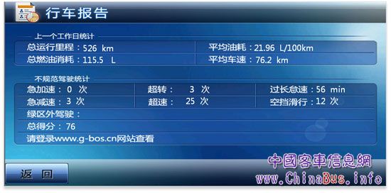 馬永升表示,除了上述功能之外,G-BOS還可以進(jìn)行故障預(yù)警,離合器打滑了、空濾該換了都有預(yù)警。“有一次我們通過數(shù)據(jù)發(fā)現(xiàn)一輛車的剎車距離過長(zhǎng),我們立即檢查了該車的剎車系統(tǒng),檢查ABS的探頭,發(fā)現(xiàn)是探頭臟了,緩速器就不起作用了,追查到是上次保養(yǎng)的時(shí)候沒有清洗干凈,探頭上留有黃油?梢,它對(duì)安全管理也有很大幫助。再比如說駕駛員沒關(guān)好車門就開車,行駛中突然倒車,應(yīng)該一擋起步他二擋起步,都可以看出來,這時(shí)候我們會(huì)電話聯(lián)系駕駛員提醒他規(guī)范操作、安全駕駛。有的駕駛員出門晚了,為了趕時(shí)間而超速行駛,這也是安全隱患,G-BOS對(duì)超速車輛也會(huì)進(jìn)行提醒。另外,車速過慢也不行,因?yàn)楸蛔惨彩且环N損失,這些不規(guī)范行為都可以通過G-BOS了解到。我們安裝G-BOS的目的不是防備、監(jiān)視駕駛員,而是為了防患于未然,在它面前,謊言將被‘打回原形’,它在實(shí)時(shí)管理上的幫助不僅可以讓車隊(duì)的管理上一個(gè)臺(tái)階,而且對(duì)于駕駛員個(gè)人來說百利而無一害。”馬永升如是說。