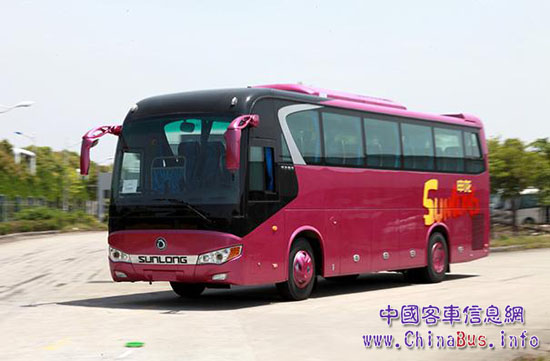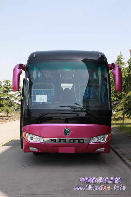 相比2012年申龍主打的雙風(fēng)擋旅游客車,SLK6118S5A無論在外型上,還是在長度上都顯得更加秀氣。遠(yuǎn)觀近瞧,SLK6118都給人一種親和感,似乎沒有什么過于前衛(wèi)的特質(zhì),但卻在平和中體現(xiàn)出中正的行者氣質(zhì)。而通體深粉色的車身在一定程度上打破了該車型稍顯保守的外形,車輛前臉線條顯出V字形,從車牌架到前大燈內(nèi)沿,再到車頂前部上方的2個前飾燈,幾個設(shè)計點(diǎn)的布局將前臉造型巧妙勾勒出來,而前臉加大的褐色覆蓋區(qū)給人以“下壓”的感覺,上深下淺的色塊組合使得深粉色車身不至于過分輕佻。在兩側(cè)前大燈中間,設(shè)計師采用簡單但大氣的鍍鉻飾板將“SUNLONG”的英文標(biāo)志鑲嵌其中,其上方的龍形圓標(biāo)則成為前臉最為提氣的“眉心痣”,上述設(shè)計也表明,申龍客車正在從造型上逐步形成自身獨(dú)特的品牌元素。