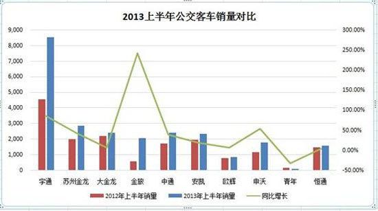 從統(tǒng)計(jì)圖表中可以看出,對(duì)公交車增長貢獻(xiàn)最大的莫過于第一軍團(tuán)!耙煌ㄈ垺彼募移髽I(yè)上半年公交的客車銷量,均明顯增長迅速。