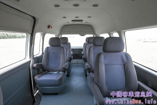 該車共9座,乘客座椅的前后間距較大,將近80cm,且靠背可以前后移動(dòng)。整車的座椅布置充分利用了車內(nèi)有效空間,并且座椅外形融入人機(jī)工程學(xué)原理。座椅設(shè)計(jì)不僅有充分的理論、數(shù)據(jù)依據(jù),還進(jìn)行了大量的試驗(yàn),從而找到最適合駕駛、保證安全而又舒適的坐姿,即便長時(shí)間乘坐也不易疲勞,車內(nèi)所有座椅構(gòu)造均符合人體曲線,乘坐舒適,令旅途行車倍感愉悅。座椅上方巨大的行李架還可存放大件行李。在正對車門處設(shè)有一張桌子,有4個(gè)座位可以倚桌而坐,桌邊的人可以讀書學(xué)習(xí)、上網(wǎng)、給手機(jī)充電,還可以圍坐聊天、打牌,為整車營造了良好的商旅氛圍。車頂鑲有吊頂,給整車增添了一絲奢華。轎車化的中控臺和豐富實(shí)用的配置體現(xiàn)了人性化設(shè)計(jì)理念。記者乘坐該車時(shí)感覺很舒適,行車過程中也感覺不到抖動(dòng)。