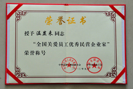 會上分別授予一批“全國關(guān)愛員工優(yōu)秀民營企業(yè)家”和“全國熱愛企業(yè)優(yōu)秀員工”稱號,授予112家企業(yè)工會“全國雙愛雙評先進(jìn)企業(yè)工會”稱號。博能集團(tuán)董事長溫顯來被授予“全國關(guān)愛員工優(yōu)秀民營企業(yè)家”稱號,博能客車公司高級工程師程漢東被授予“全國熱愛企業(yè)優(yōu)秀員工”稱號。
