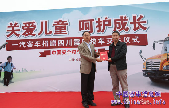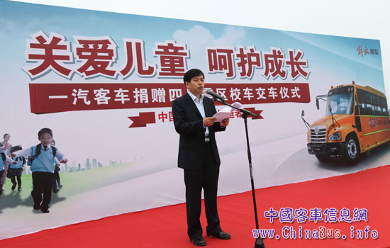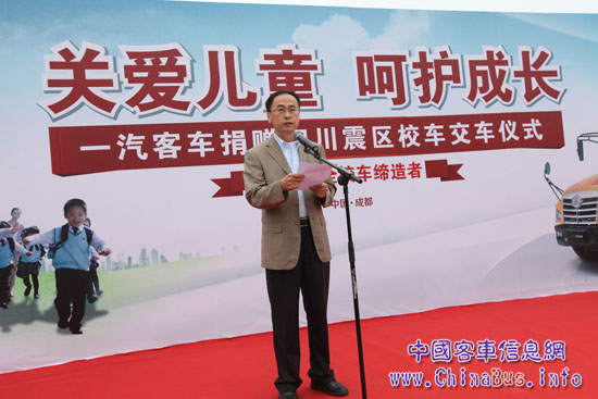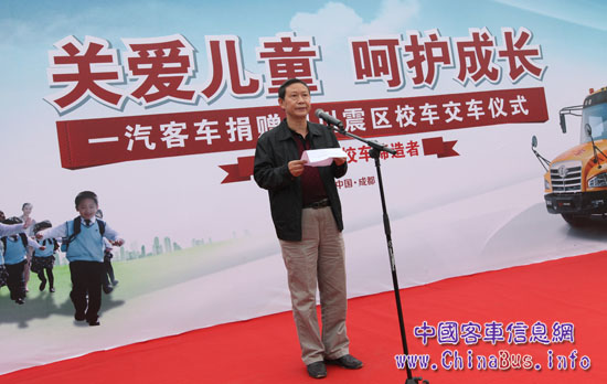 一汽集團(tuán)成都事業(yè)部黨委書記王琳致辭,一汽作為作為國有特大央企,堅持踐行社會責(zé)任。繼前次捐贈55輛坤程皮卡和20輛解放J6L支持災(zāi)區(qū)重建,這次由一汽客車公司精心制造了6輛校車捐助給震區(qū)學(xué)校使用。這批校車是一汽客車歷時3年自主研發(fā)的精品,秉承了一汽“品質(zhì)、技術(shù)、創(chuàng)新”的品牌內(nèi)涵和“爭第一、創(chuàng)新業(yè)、擔(dān)責(zé)任”的價值理念,嚴(yán)格按照美國校車的制造標(biāo)準(zhǔn),完全滿足了《國標(biāo)》校車的技術(shù)標(biāo)準(zhǔn),安全性能遠(yuǎn)遠(yuǎn)超過普通公共汽車。