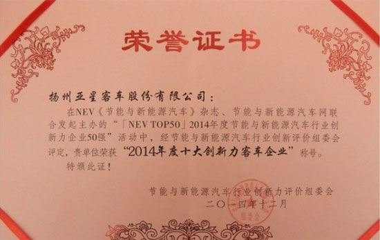 2014年全國(guó)客車行業(yè)最具影響力的活動(dòng)之一——BUSTEC國(guó)際客車技術(shù)展(2014中國(guó)(上海)節(jié)能與新能源汽車展覽會(huì))于12月18日至20日在上海世博展覽館舉行,為期三天的展示圓滿結(jié)束。亞星客車此次攜三款精品客車亮相,分別是JS6128GHEVC氣電混合動(dòng)力 公交車、YBL6905H1QJ藍(lán)鉆中巴、JS6100XCJ小學(xué)生專用校車,展會(huì)期間,在NEV《節(jié)能與新能源汽車》雜志、節(jié)能與新能源汽車網(wǎng)聯(lián)合發(fā)起主辦的“2014年度節(jié)能與新能源汽車行業(yè)創(chuàng)新力企業(yè)50強(qiáng)”的評(píng)選活動(dòng)中,亞星客車榮獲“2014年度十大創(chuàng)新力客車企業(yè)”稱號(hào)。