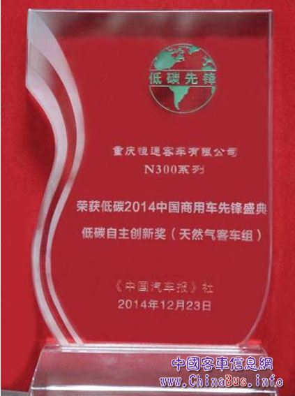 為充分展示商用車領域的低碳技術,樹立環(huán)保典范,2014年12月23日,由《中國汽車報》社主辦的“低碳2014·中國商用車先鋒盛典”在北京隆重舉行,活動正式發(fā)布了2014年度低碳環(huán)保車型的評選結果。恒通N300系列客車憑借優(yōu)異的燃氣客車核心技術,從眾多參評客車中脫穎而出,榮獲“低碳自主創(chuàng)新獎”殊榮。