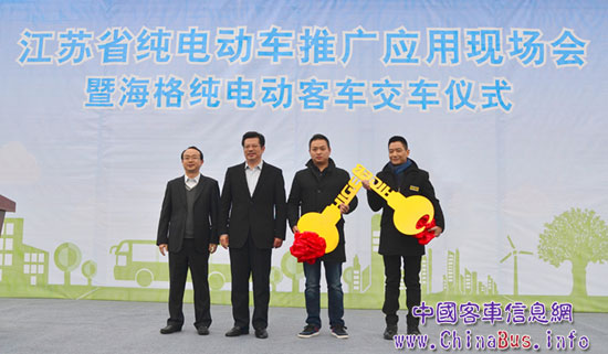 此次海格純電動客車交車儀式,同時也是江蘇省純電動車推廣應用現場會。江蘇省政府副秘書長王志忠,江蘇省經信委、財政廳、政府辦公廳、運輸管理局以及南京市新能源汽車相關部門分管領導悉數到場。據了解,到2015年底前,南京計劃完成7000輛左右新能源汽車的推廣任務。