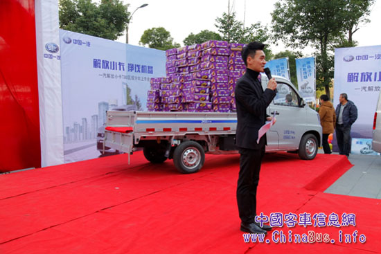 在活動現(xiàn)場,解放T80新車一亮相讓就讓人充滿驚喜,在近千人的關(guān)注下,解放T80滿載著重裝厚禮大氣出場,這種方式讓人對解放T80的超大裝載容量充滿期待。隨后一輛行業(yè)內(nèi)公認(rèn)的“最大微客“的佳寶V80L從另一個方向出現(xiàn),車門打開后,車內(nèi)滿載方便面箱。在主持人的煽動下,現(xiàn)場客戶紛紛猜測方便面箱的數(shù)量,當(dāng)203箱方便魔術(shù)般地從超級大微客佳寶V80L車中卸下,象一堵墻一樣碼放在地上,真正的高潮才剛剛開始: 在眾多客戶的共同參與下,方便面箱很快被裝到解放T80車箱內(nèi),競猜繼續(xù)進(jìn)行。最終實測T80可以裝載500箱,這讓眾位客戶徹底驚呆了!發(fā)布環(huán)節(jié)結(jié)束后,經(jīng)銷商告訴記者除了驚人的裝載容量,解放T80還獨(dú)具三大優(yōu)勢、創(chuàng)新的設(shè)計元素及領(lǐng)先行業(yè)的服務(wù)模式,并系統(tǒng)的進(jìn)行了介紹: